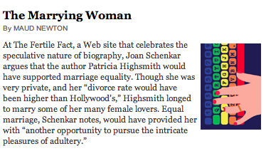 Last week’s columnlet was on Joan Schenkar’s speculations about Patricia Highsmith and marriage equality for The Fertile Fact. Another recent one was devoted to Brett Fletcher Lauer’s faux Missed Connections, which he wrote about for A Public Space.