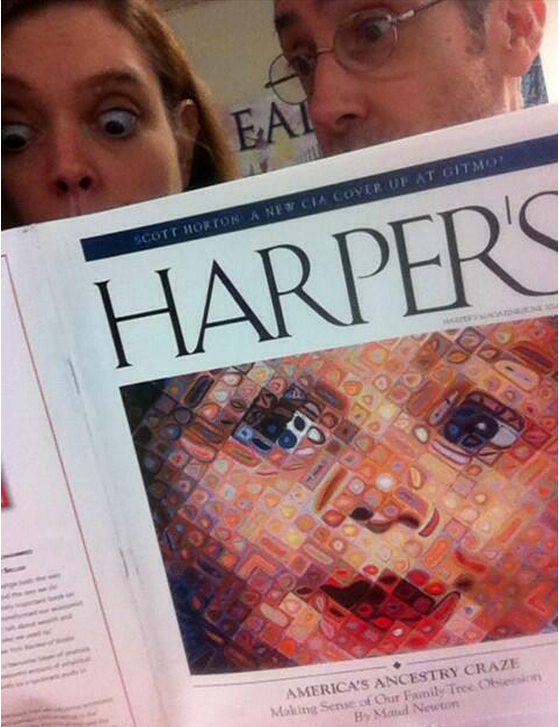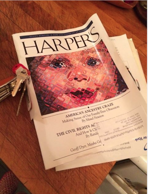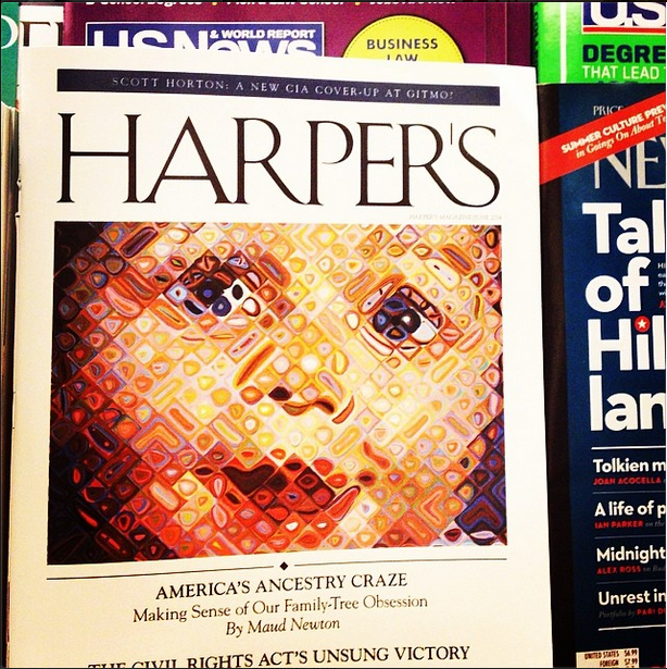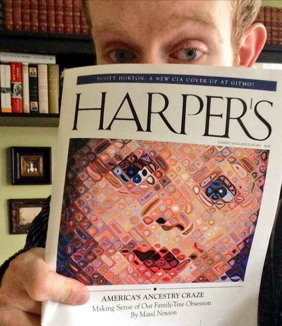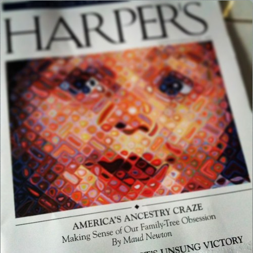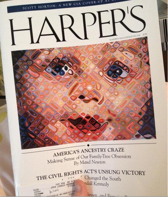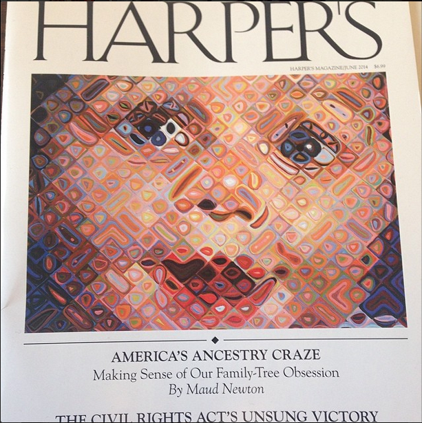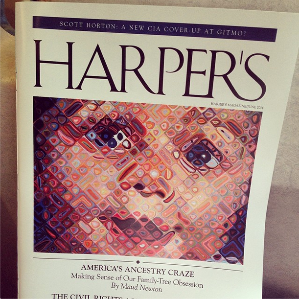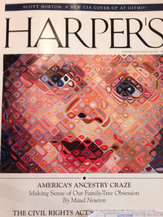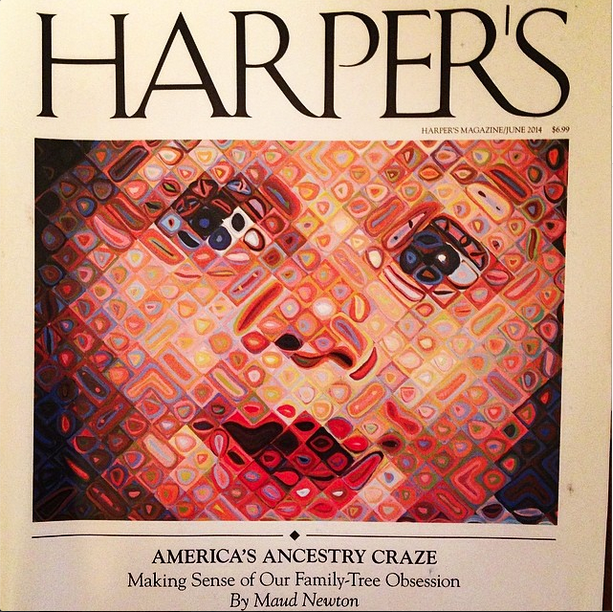 My essay, “America’s Ancestry Craze,” illustrated with Chuck Close’s “Emma,” is the cover story of the June issue of Harper’s! It’s an outgrowth of a longtime obsession, as people who visited this site in the long-ago days when it was frequently updated might recall. Friends and readers connected with me on Twitter, Facebook, Tumblr, and Instagram have been posting photos of the cover, and every time I see one it gives me a thrill.