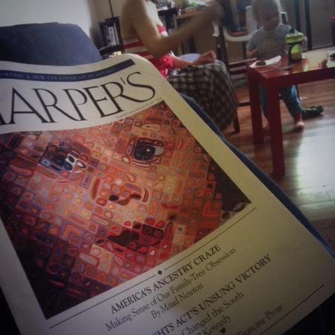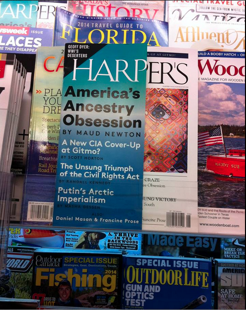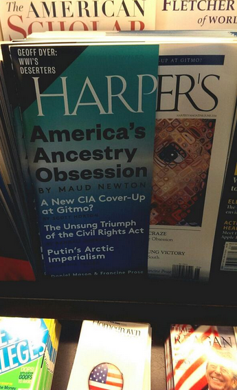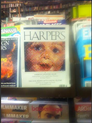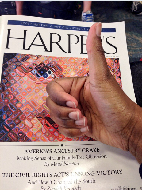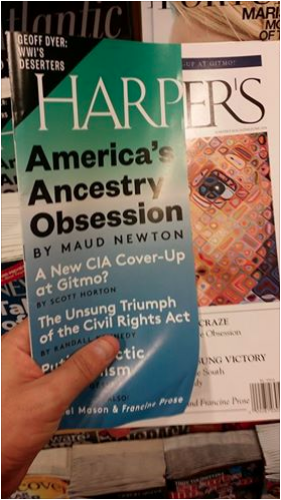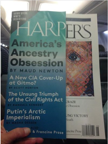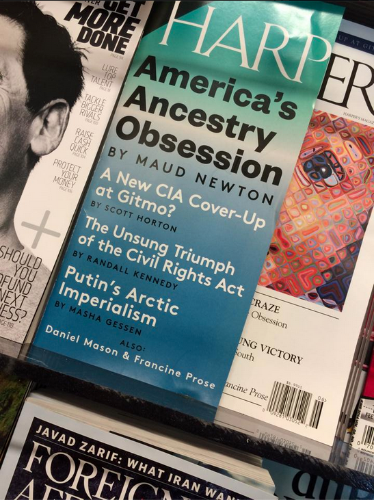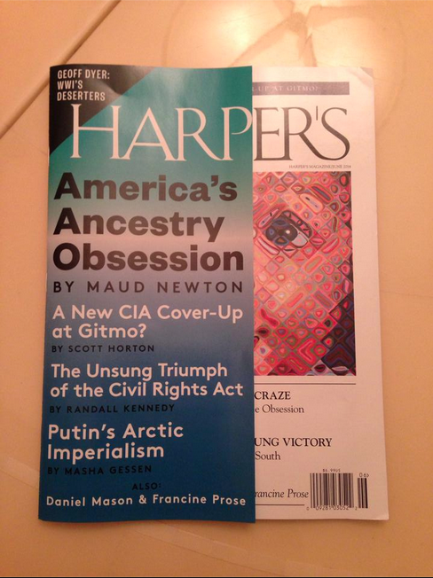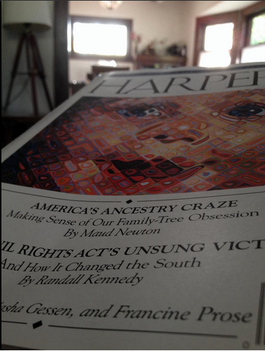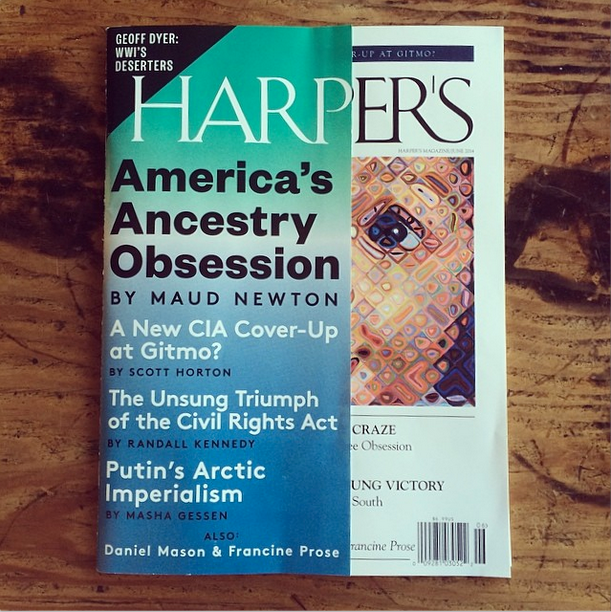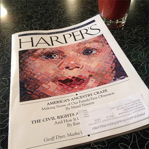 My essay, “America’s Ancestry Craze,” illustrated with Chuck Close’s “Emma,” is the cover story of the June issue of Harper’s! It’s an outgrowth of a longtime obsession, as people who visited this site in the long-ago days when it was frequently updated might recall. Friends and readers connected with me on Twitter, Facebook, Tumblr, and Instagram have been posting photos of the cover, and every time I see one it gives me a thrill.